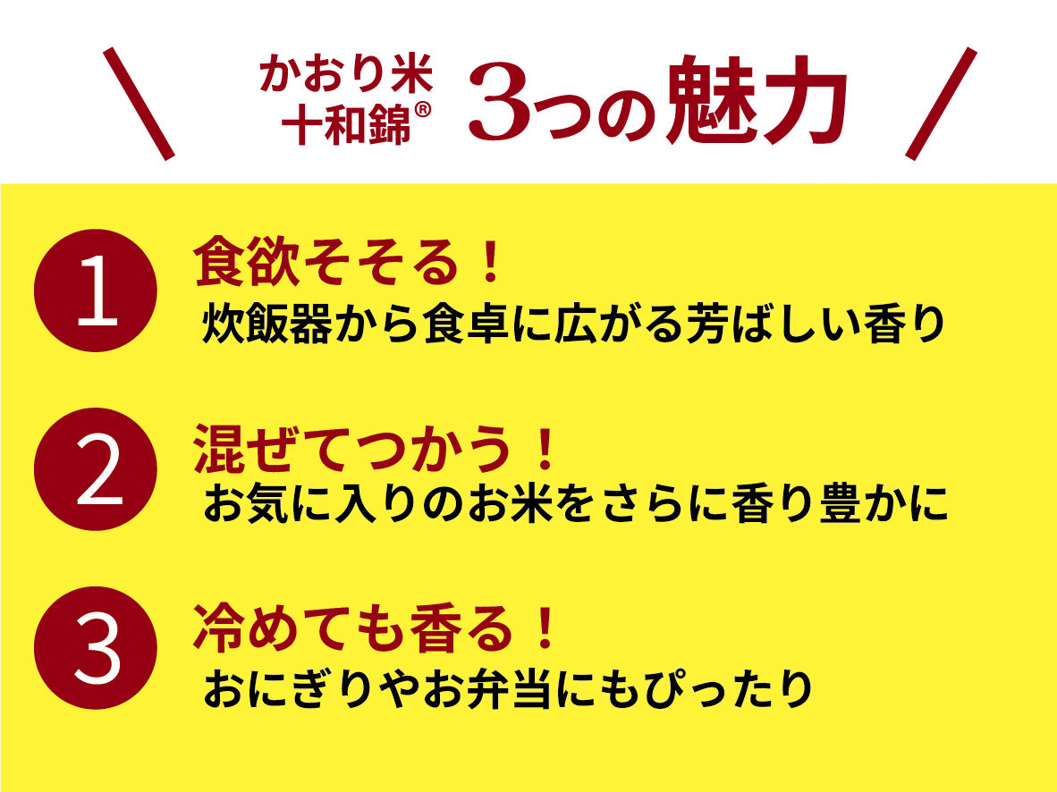 炊きたてのかおり米がふんわり香るだけで、食卓も心も幸せに包まれます。