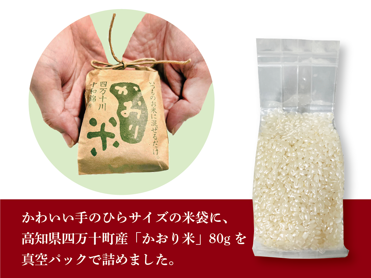 かわいい手のひらサイズの米袋に、高知県四万十町産「かおり米」80gを真空パックで詰めました。