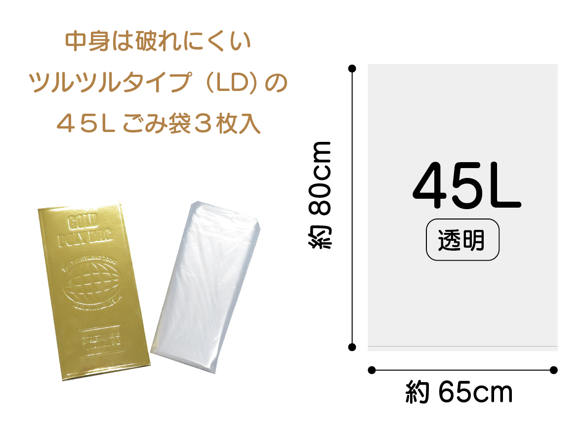 中身はやぶれにくいLDタイプの45Lごみ袋3枚入。もらって役立つ、嬉しい日用品です。